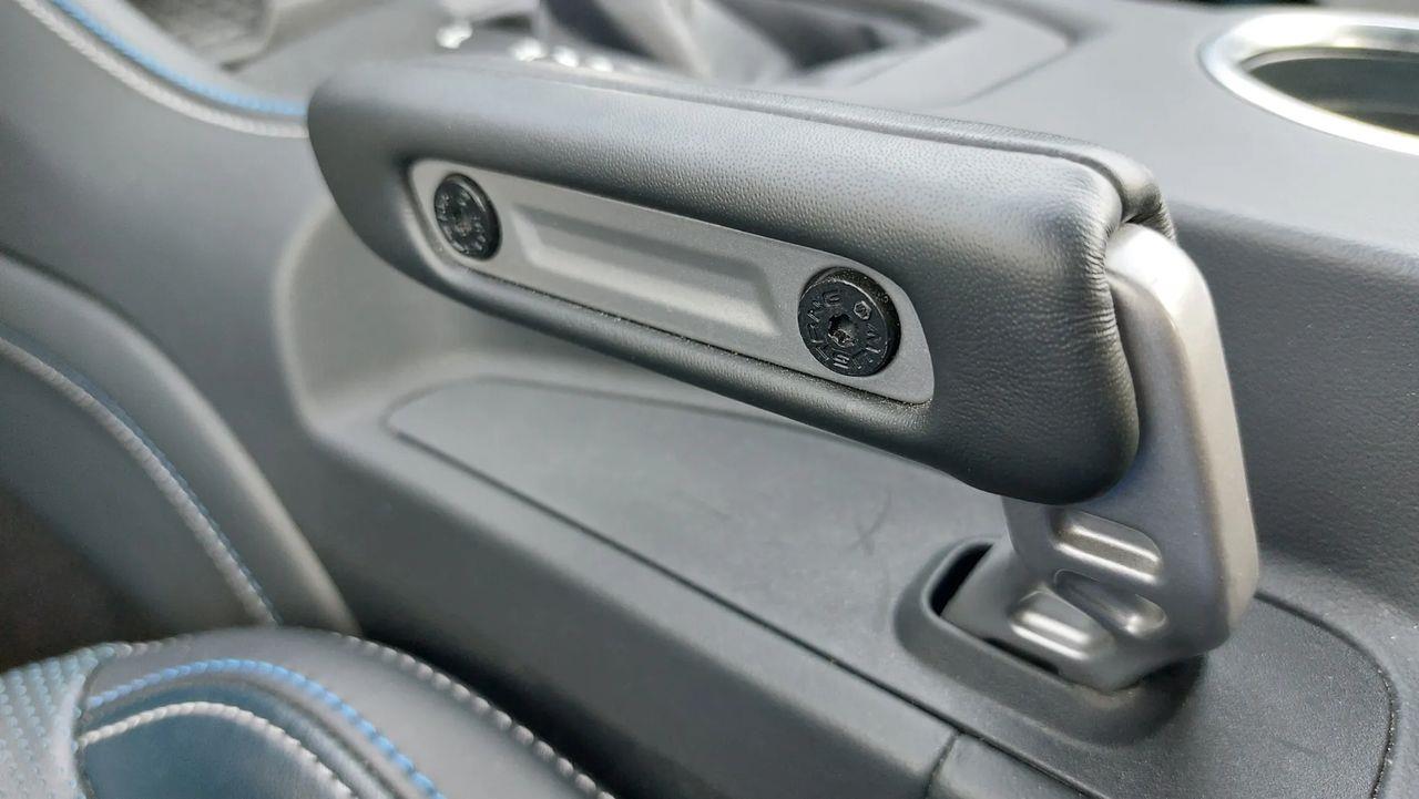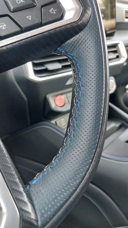 • Fotele – z tapicerką skórzaną perforowaną z elementami Vinylu, w tonacji Navy Pier, z przeszyciami Metal Grey i Raptor Blue