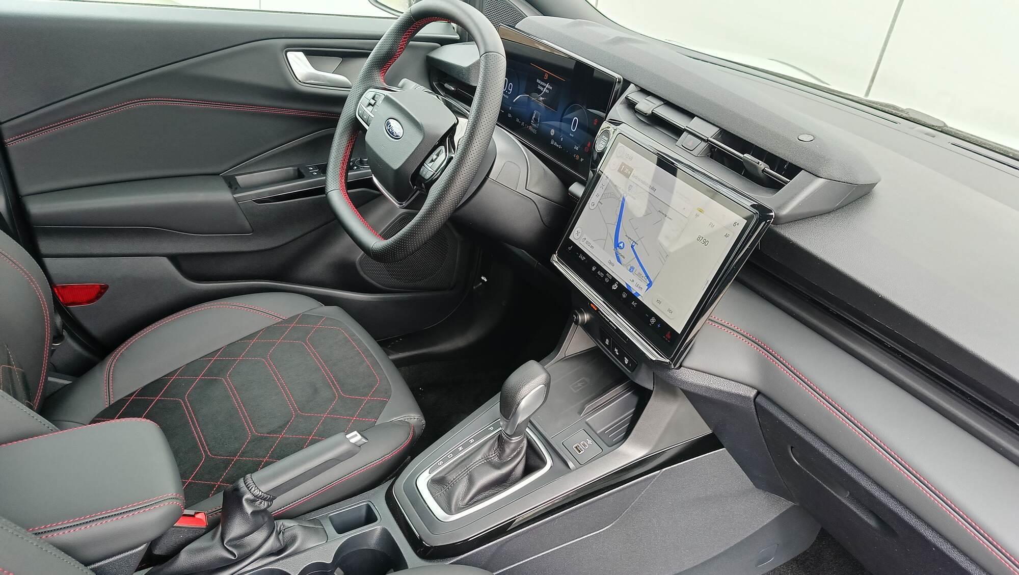 - Przednie fotele – z tapicerką Neosuede/Vinyl z elementami skóry ekologicznej w ciemnej tonacji, z przeszyciami w kolorze czerwonym, styl sportowy.