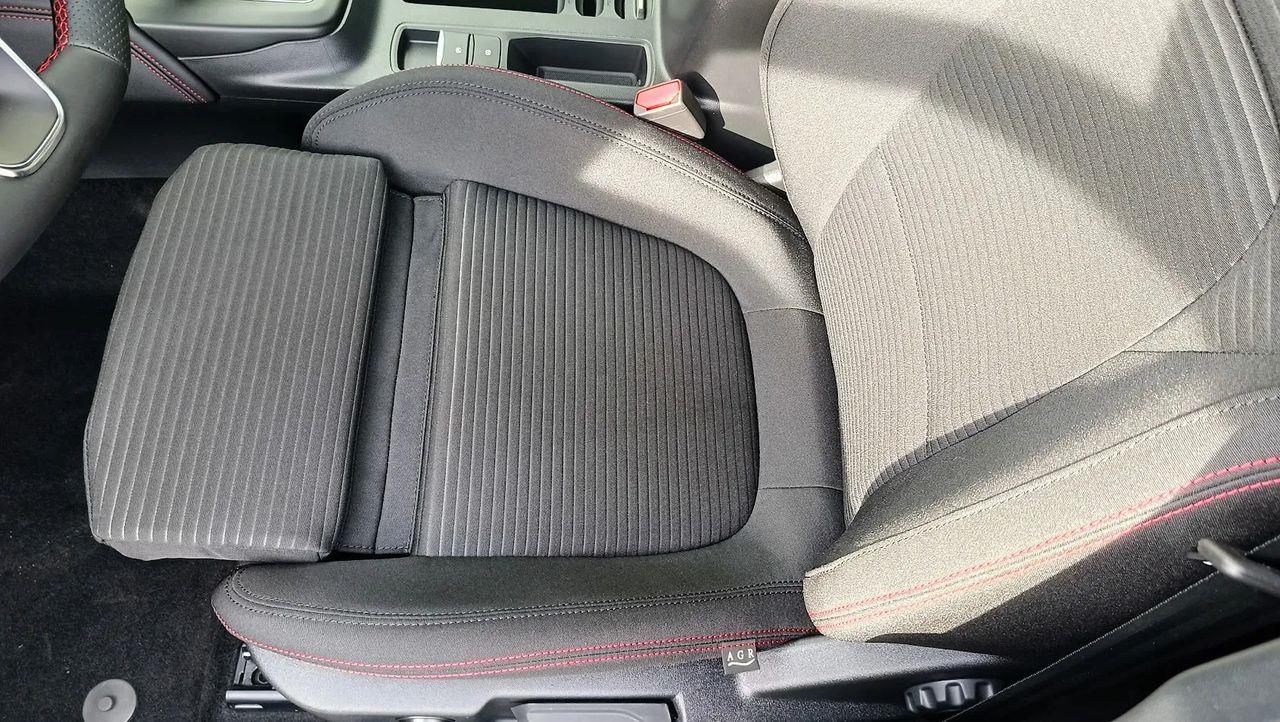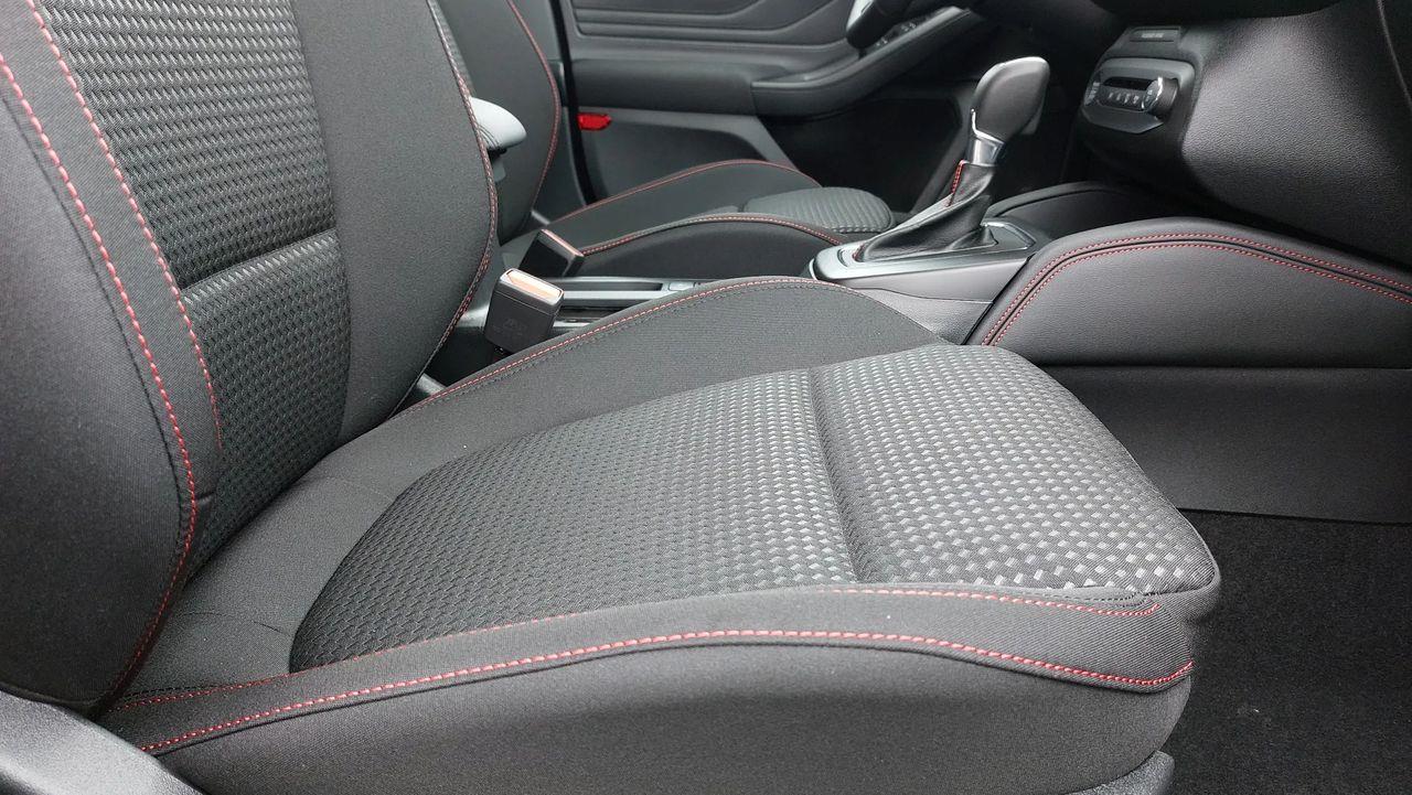 - Fotele - z tapicerką materiałową Foundry w ciemnej tonacji, z czerwonymi przeszyciami