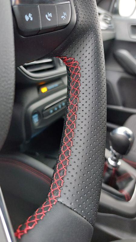 Kierownica - trójramienna, spłaszczona u dołu, wykończona skórą ekologiczną Sensico z czerwonymi przeszyciami