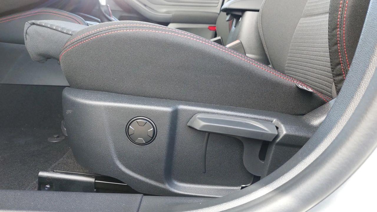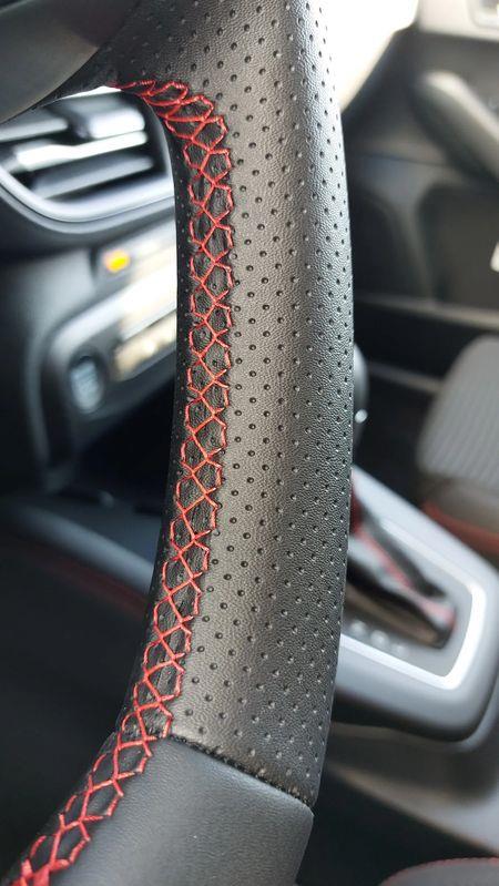Kierownica - trójramienna, spłaszczona u dołu, wykończona skórą ekologiczną Sensico z czerwonymi przeszyciami