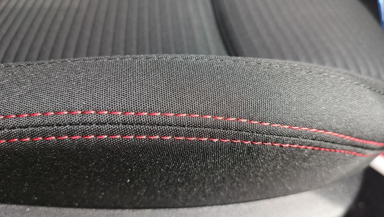 Kierownica - trójramienna, spłaszczona u dołu, wykończona skórą ekologiczną Sensico z czerwonymi przeszyciami