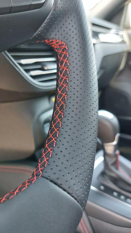 Kierownica - trójramienna, spłaszczona u dołu, wykończona skórą ekologiczną Sensico z czerwonymi przeszyciami