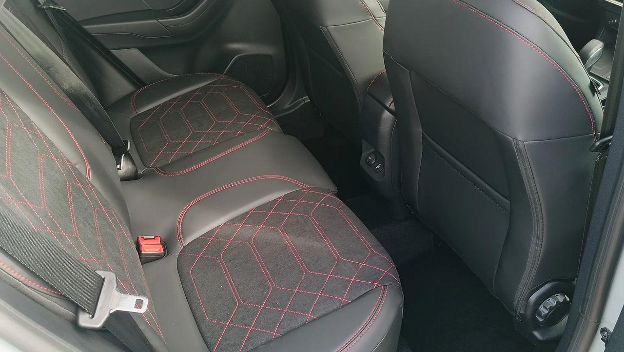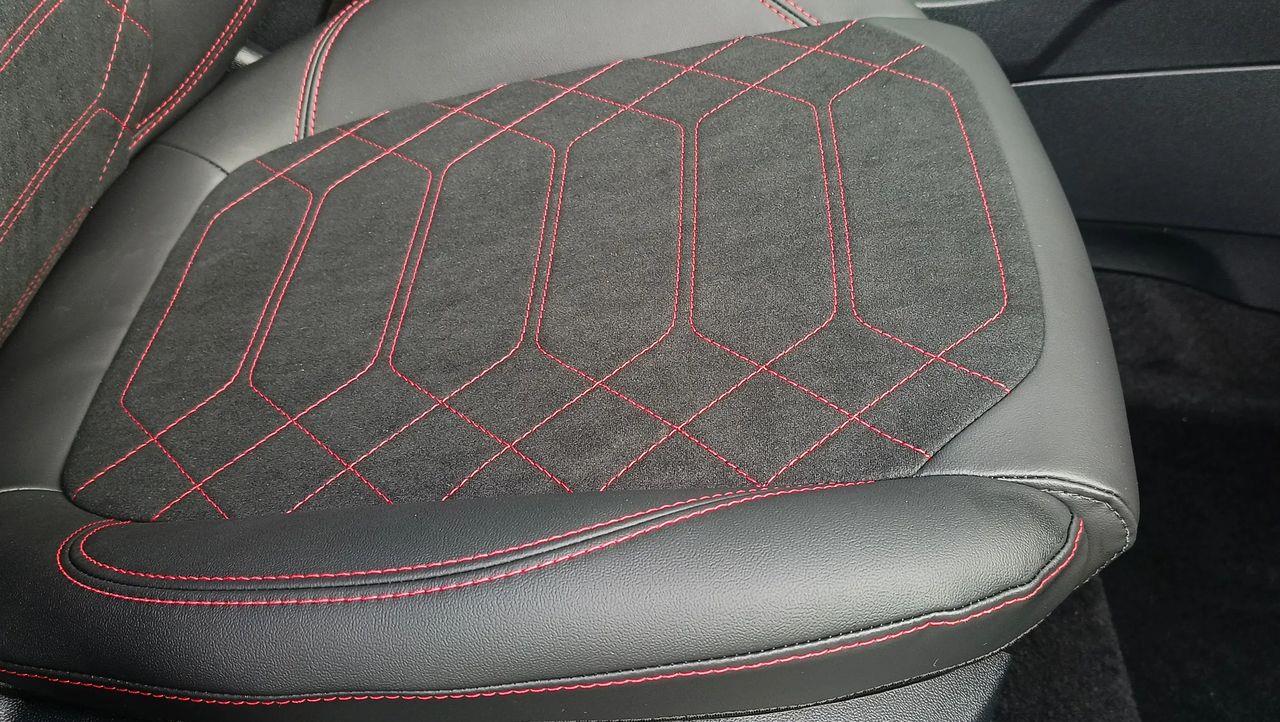 Przednie fotele – z tapicerką Neosuede/Vinyl z elementami skóry ekologicznej w ciemnej tonacji, z przeszyciami w kolorze czerwonym, styl sportowy