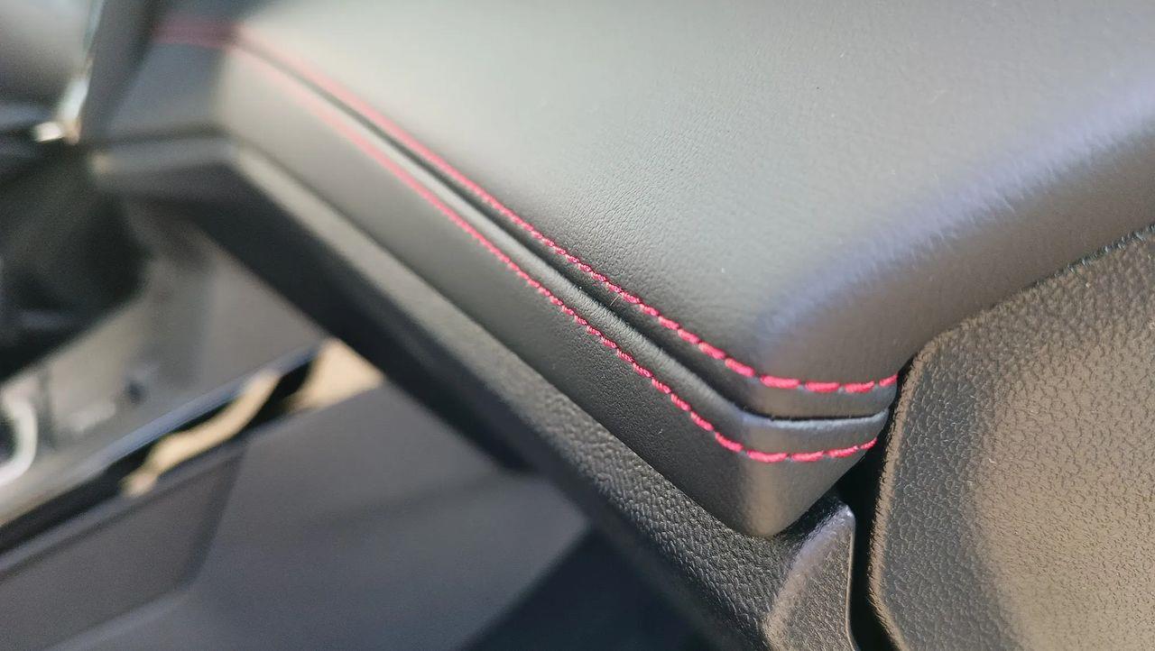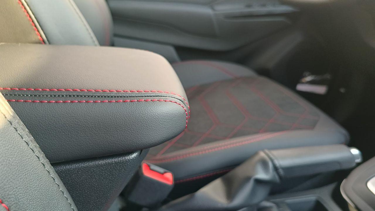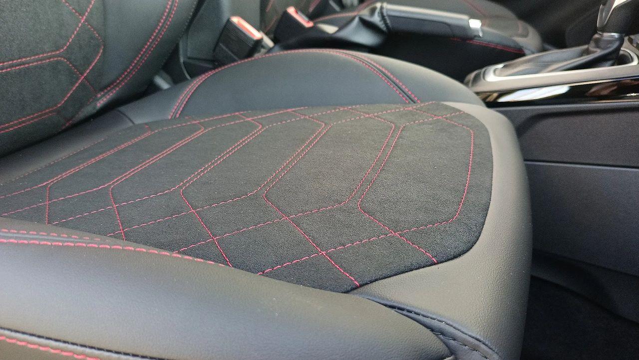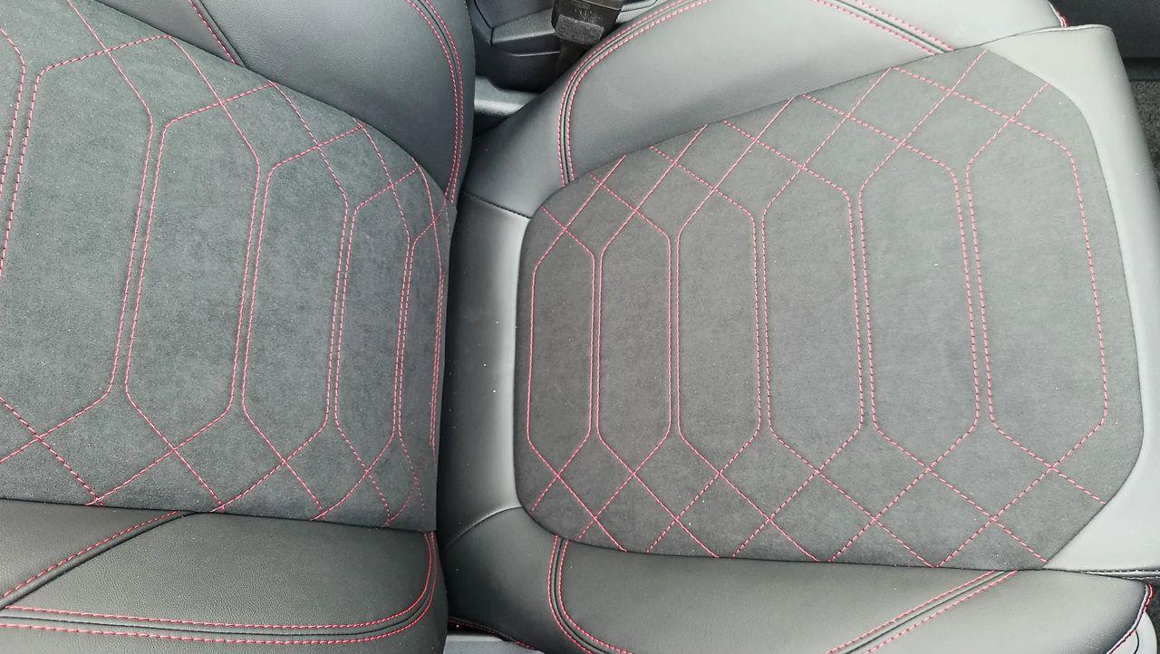Przednie fotele – z tapicerką Neosuede/Vinyl z elementami skóry ekologicznej w ciemnej tonacji, z przeszyciami w kolorze czerwonym, styl sportowy